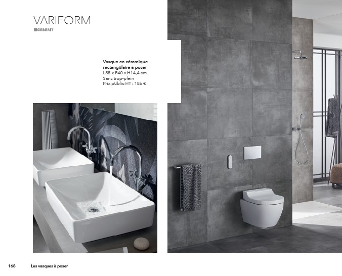 Vasque en céramique rectangulaire à poser L55 x P40 x H14,4 cm. Sans trop-plein Prix public HT : 186 € VARIFORM Les vasques à poser 168