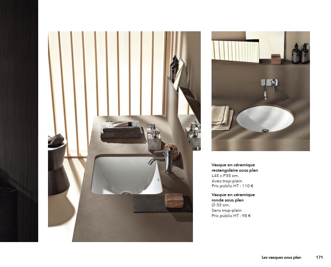 Vasque en céramique rectangulaire sous plan L45 x P35 cm. Avec trop-plein Prix public HT : 110 € Vasque en céramique ronde sous plan Ø 33 cm. Sans trop-plein Prix public HT : 98 € Les vasques sous plan 171